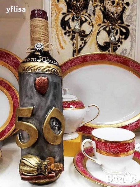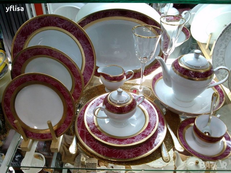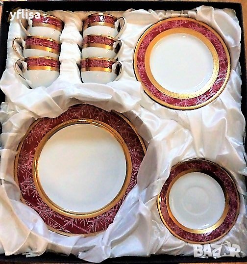 Комплект чинии - 18 бр. от висококачествен фин порцелан, декориран с гравиран, златен кант.