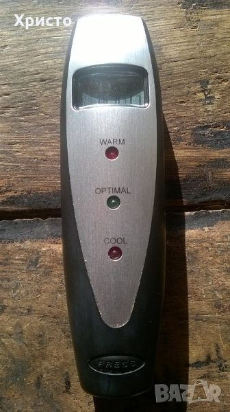 Продавам вино тестер електронен за оптимална температура за консумация уникат, метал и пластмаса в калъф от качествена еко кожа. Размер в сгънат вид 14х4х3 см. При натискане бутона PRESS изскача метална твърда пръчка дълга 10 см която се потапя във виното. От горната страна бутона SELECT сменя на дисплея различните видове вино. Има 2 светещи лампички в червено и едно в зелено в средата.