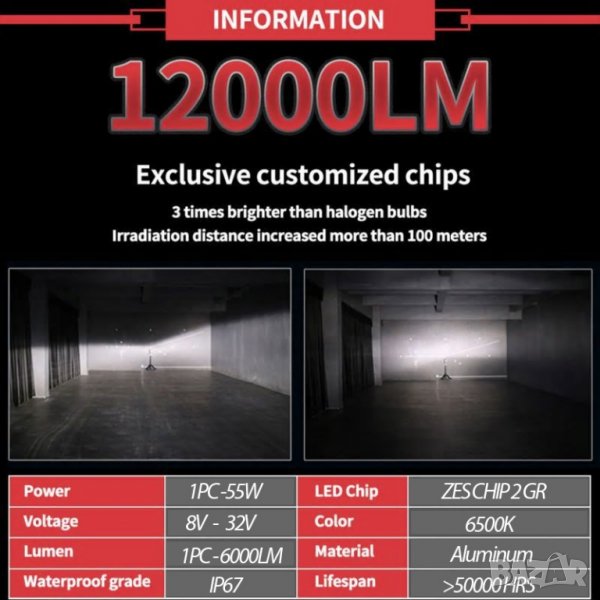 55W @ 6000LM всяка крушка, общо 110W @ 12000LM на двойка, 5 пъти по-ярка от халогенни светлини