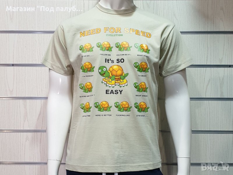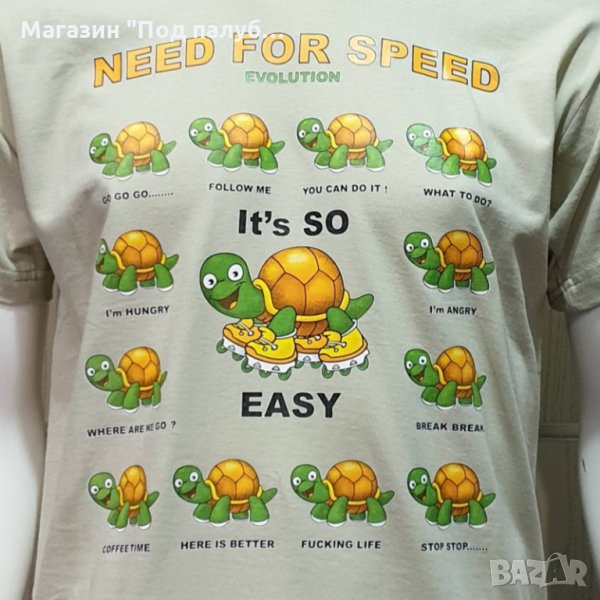 Страхотна нова забавна мъжка тениска в цвят екрю и трансферен печат NEED FOR SPEED с костенурки. Тениската е изработена в България под марката PRINTEX от висококачествен 100% пениран памук на 170 гр./м², който запазва цялостта на материята и наситеността на цветовете. С удобна кройка, тениската е свободна и позволява максимален комфорт при носене. Професионално изработен висококачествен трансферен печат, устойчив на пране с години. Тениската може да се пере при температура до 40 градуса. Спокойно можем да гарантираме за качеството на изработката и ярките цветове на дизайна.
