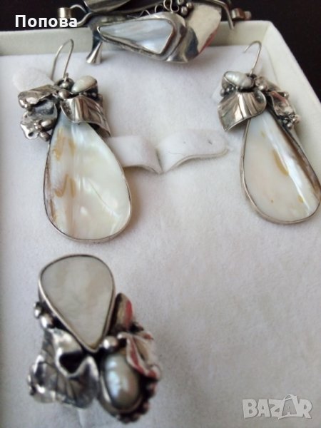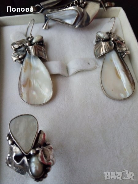 седеф. Обеци и пръстен проба 950 купувани в чужбина. Перфектна ръчна майсторската изработка. Авторът е поставил своите инициали и печат за среброто. Гривната е на друг майстор бижутер, също с поставени инициали и проба на среброто.Бижутата са великолепни на живо.