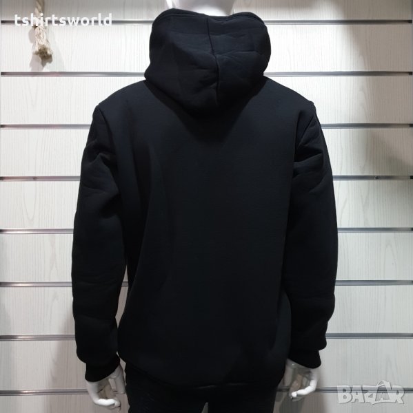 Страхотен нов мъжки черен изчистен суичър с качулка и две джобчета. Произведен в България под марката PRINTEX от висококачествен 100% памук - триконечна пенирана вата с кардировка, което го прави изключително топъл и желан от нашите дългогодишни клиенти. Моделът е подходящ за пролетния и есенно-зимният сезон, има ластични маншети на китките и ханша, запазващи топлината. Разполага с мека подплата и два отворени джоба в страни. Свободната кройка го прави подходящ както за спорт така и за ежедневно носене с дънкови панталони.