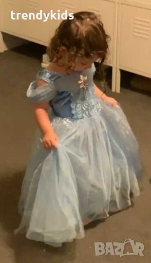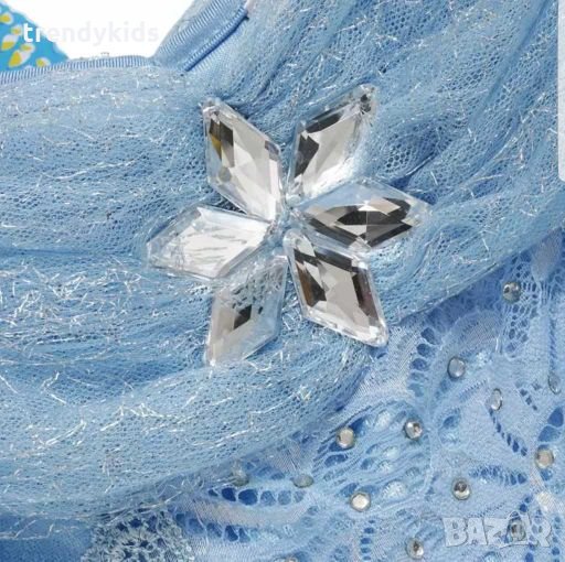 НОВА ЛУКС Приказна- разкошна рокля на Пепеляшка или на Ледената кралица . Горната част е изработена от еластично кадифе, около раменете с богат пласт прозрачно-син тюл, на гърдите има кристална снежинка. Полата е бухнала с пластове тюл и шифон! По желание могат да се поставят пеперуди на нея ( включени).