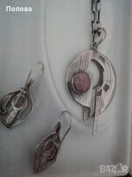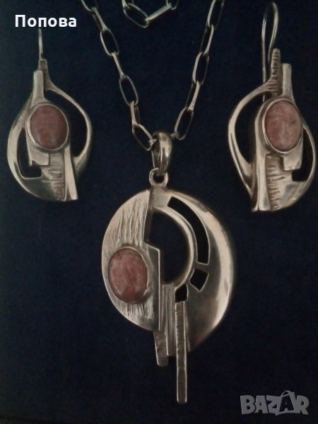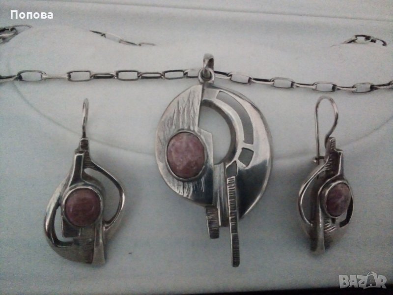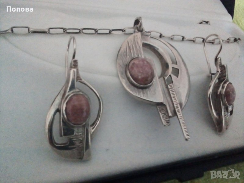 Уникален авторски масивен сребърен комплект с естествени камъни, проба 925. Обеци с дължина 4,5 см. и стабилно закопчаване. Медальон 6 см. с халка та, синджир италианско сребро, 40 см., много здрава плета.Стоят супер стилно. Не ги деля. Цената е без коментар.