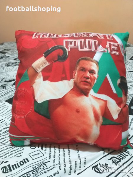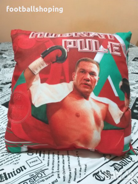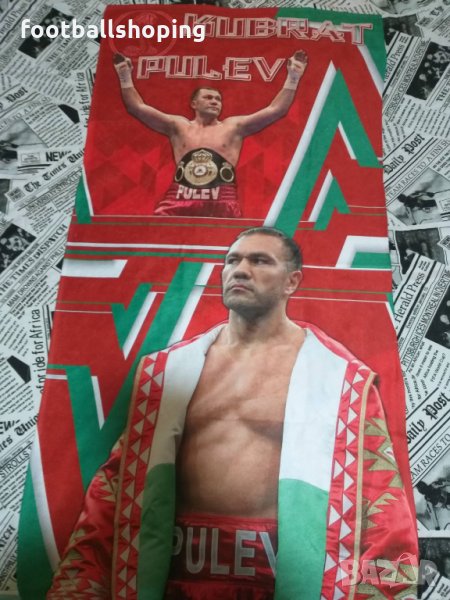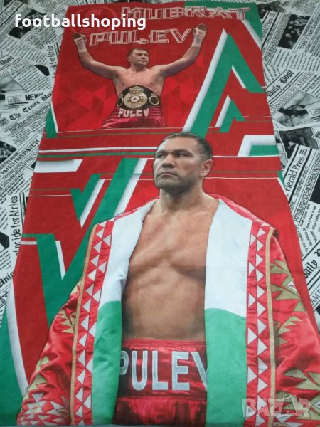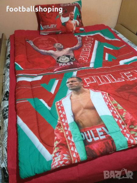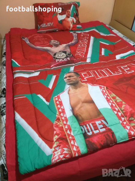 Предлагам спортни артикули на Легендата Кубрат Пулев - Декоративна възглавничка 40/40см,Хавлии (малка 50/30см и голяма 140/70см) и Спален комплект ,включващ долен чаршаф 150/200см,калъфка 50/70см и завивка 140/200см.По Ваше желание завивката може да бъде заменена с горен плик.Материята на спалният комплект е памук с микрофибър.Хавлиите са 100% памук. Цена: Възглавничка - 12лв,Хавлии(комплект малка с голяма) - 30лв и Спален комплект - 75лв със плик,80лв със завивка.За повече информация се обадете на посоченият телефон.Моля разгледайте и другите обяви в профила ми :) Посетете facebook страницата ни - FOOTBALLSHOPING :)