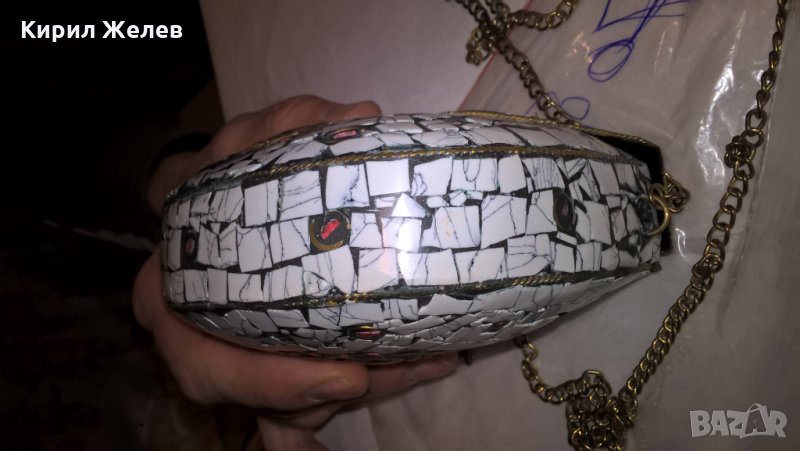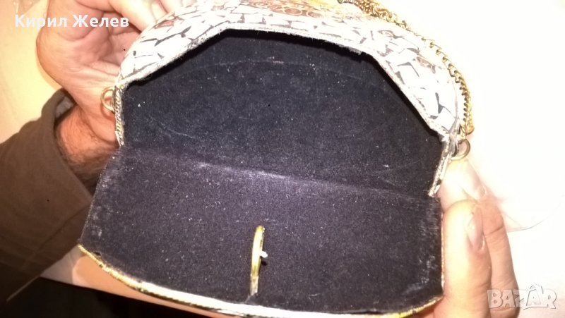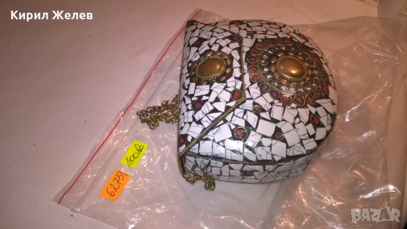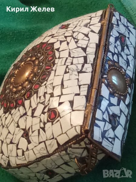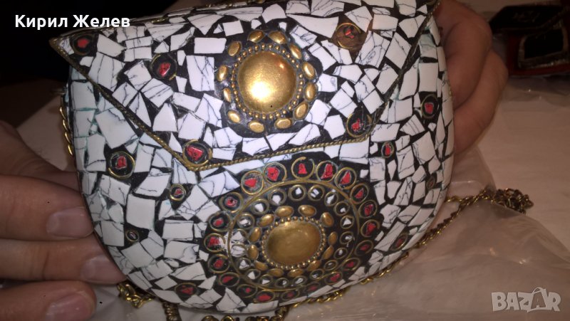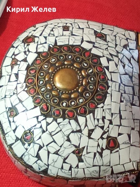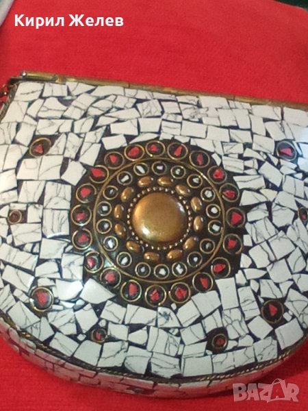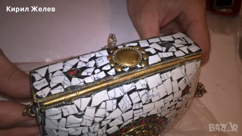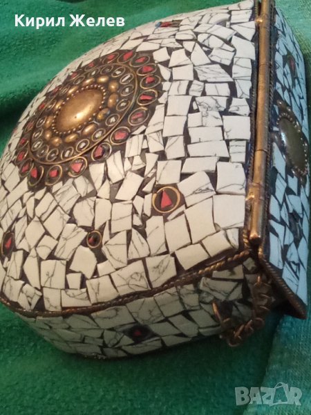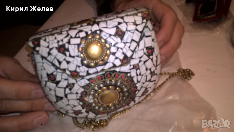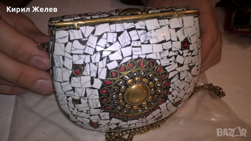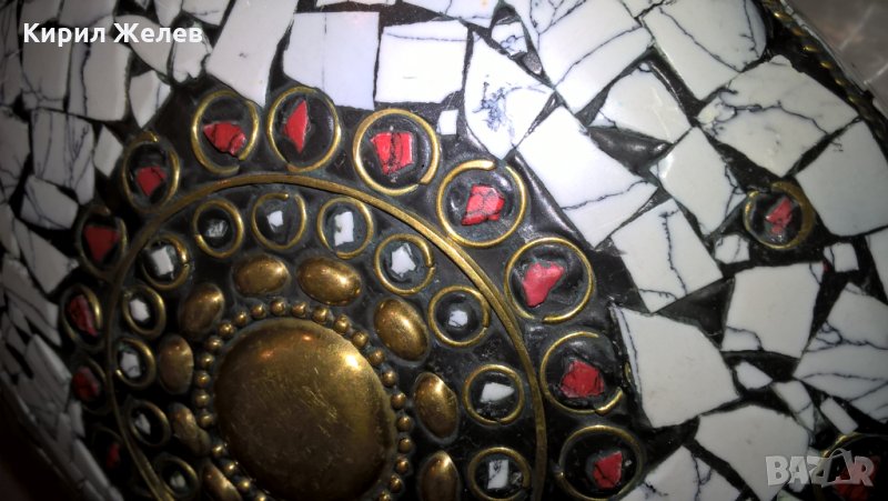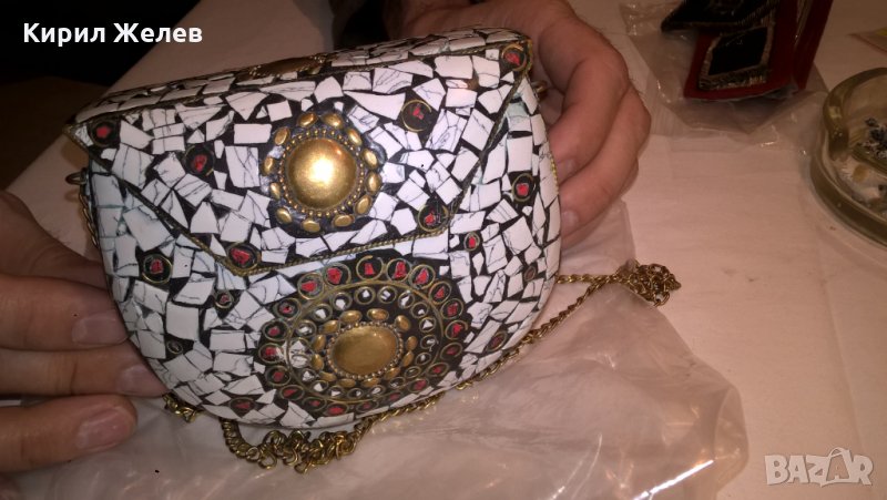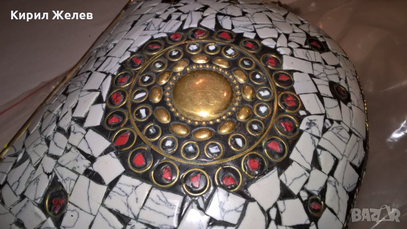 Във великолепно, видно от снимките, състояние; старинна изцяло ръчна майсторска художествена изработка, предполагам края на 19ти - начало на 20ти век, османски или индо-персийки традиционен стил. Обкована е с естествен седеф и червен корал и други скъпоценни камъни като мозайка инкрустирани от майстора. Въобще, един 100% колекционерски екземпляр, който няма къде да откриете другаде - достойна за принцеса от 1001 нощ!