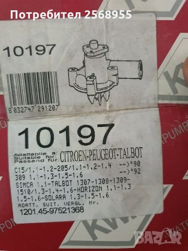 KWP 10197 Водна помпа CITROEN C15 / PEUGEOT 205 206 309 / TALBOT / 1968-2013 / OE 120145 OE 32461Q /, снимка 1 - Части - 28324437 KWP 10197 Водна помпа CITROEN C15 / PEUGEOT 205 206 309 / TALBOT / 1968-2013 / OE 120145 OE 32461Q /, снимка 2 - Части - 28324437 KWP 10197 Водна помпа CITROEN C15 / PEUGEOT 205 206 309 / TALBOT / 1968-2013 / OE 120145 OE 32461Q /, снимка 3 - Части - 28324437 1/3