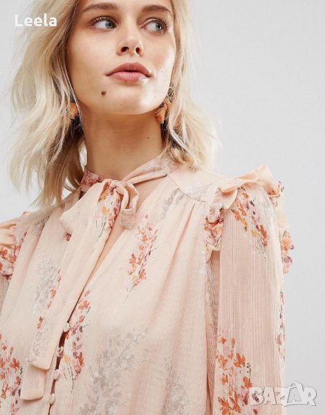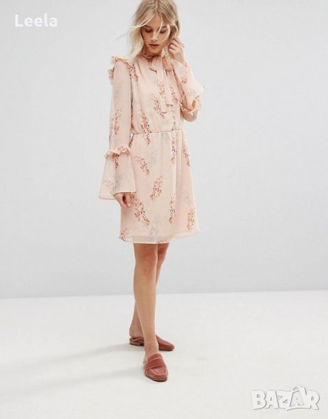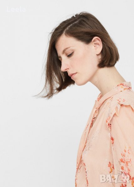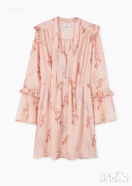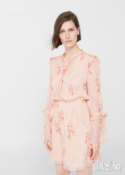 Дамска рокля на Mango Suit от прасковено-розов шифон, с флорален десен, ефирни ръкави тип 'камбанка' и подплата в телесен цвят.