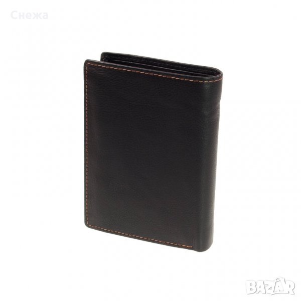 Портфейла е чисто нов с етикета и в оригиналната си кутия. На фирмата M-Collection, а модела му е Merlin Hardwin Billfold V11. Портфейла е изработен от черна естествена кожа, която е мека и приятна на допир и подплата от полиестер от вътрешната страна. Обшит е с оранжев конец. Вертикален тип. И разполага с множество от отделения за карти или: