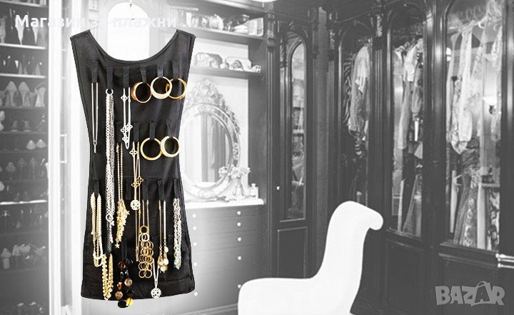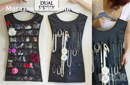 Органайзер за бижута - Двулицев съхранението на бижутата е от голямо значение за всяка жена, защото тя държи много на тях, независимо далисаскъпи или евтини. Изобщо не е приятнаситуацията, когато бързаме и не можем да намерим бижуто, което е най- подходящо за тоалета ни или чифтът му, ако говорим за обеци, а още по - лошо е, когатосме го изгубили. Ние имаме едно оригинално предложение засигурно и надеждносъхранение на вашите бижута, така че да ги намирате бързо и лесно винаги, когато Ви потрябват и това е този двулицев органайзер за бижута! Той е под формата на рокля, коятосе е закача на закачалка. Този органайзер несамо ес интересен вид, но е и компактен,събира много бижута и от начина, по койтосесъхраняват, теса лесно откриваеми и видими. От еднатастрана можете да закачите вашите колиета и по - едри бижута, а от другата ес малки отделения, в които може дасложите по - дребните, както и вашите аксесоари. Той е и двулицев Вие ще решите кой цвят Ви допада най - много и кой би подхождал най - добре на вашето помещение и интериор, а когато Ви омръзне просто го обърнете от другатастрана и ще внесете така желаната от Вас промяна. Поръчайте този органайзерсега и забравете заскъпите и изгубени бижута, които все още не знаете къдеса, подредетесвоите аксесоаристилно!