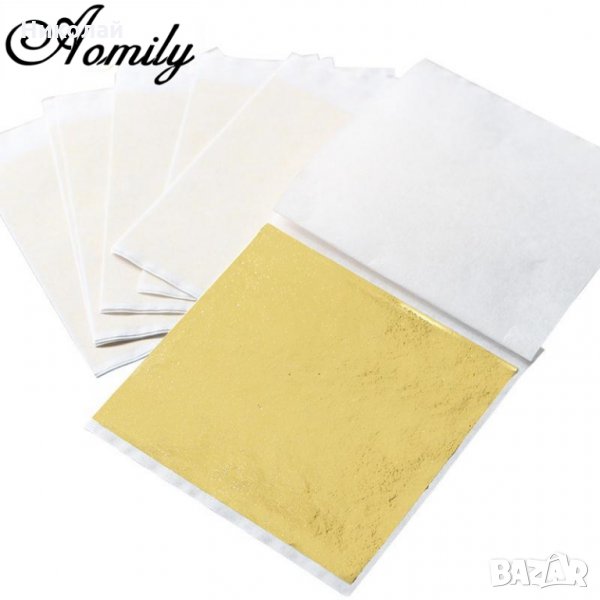 Златно фолио на листи от по 8 х 8 см. Всеки лист е опакован и разделен с хартиен плик , това предпазва от слепване на фолиото . Подходящо е за декорация на предмети , статуетки , декоративни елементи от дома , стени и тавани , сладкиши , декупаж , украсяване на маски и др.