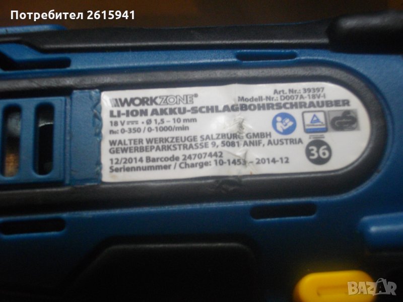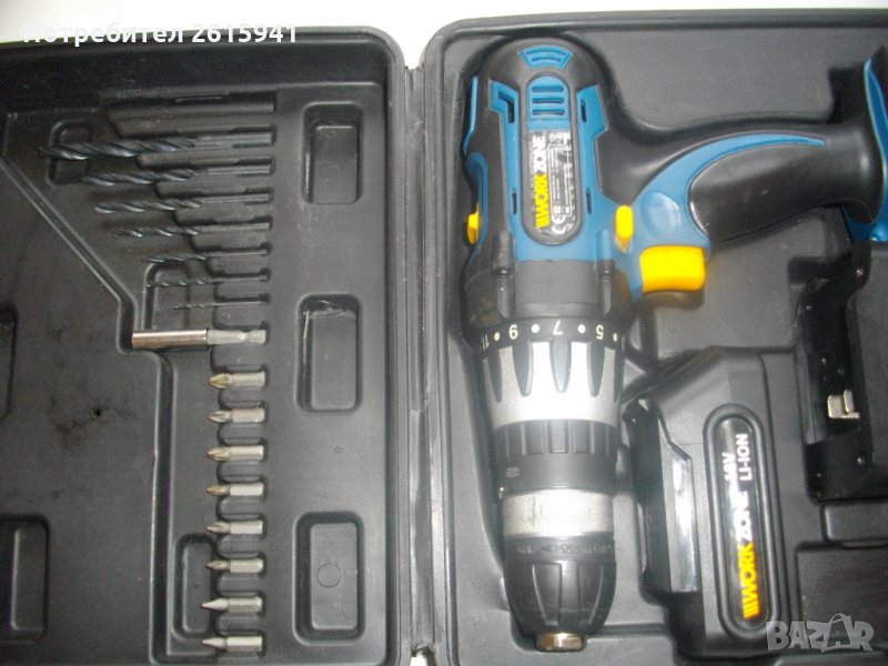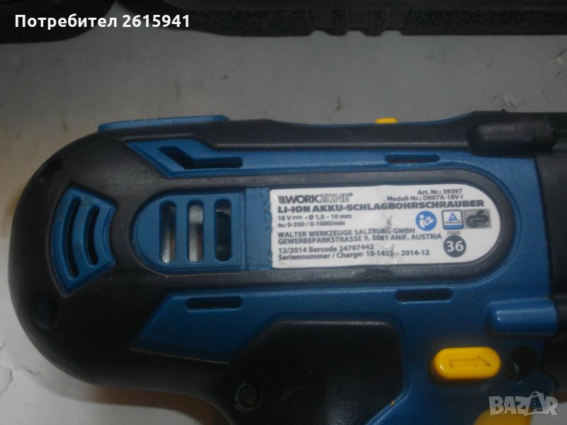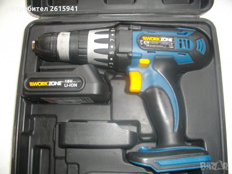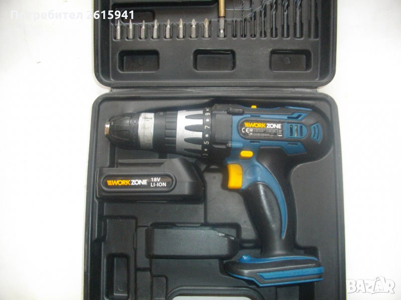 ЗАБЕЛЕЖКА-бодито прехвърля степените,съединителя буксува.18 ударна волтова акумулаторна бормашина,винтоверт-дрелка,литий-йон технология,професионален модел на Уоркзоне.Машината е почти нова,с много запазен външен вид и техническо състояние-бодито прехвърля степените на тнатягане..Силно,мощно и ефективно върти,но прехвърля стерените-буксува..Марка и модел на машината-Workzone D-007A-18V-1.Винтоверта е професионален-с метални части вътре,издържащи на по-големи натоварвания.Марка и модел-Workzone D007A-18A-1.Мощност на мотора-18 волта,2 скорости,15 степени на натягане,функция пробиване и функция удар.Обороти-0-350 и 0-1000 в минута.Патронник-метален,оригинален на марката,универсален,самонатягащ от 1,5 до 10 мм.Вграден ел.графичен горен дисплей ниво заряд батерия.Долен вграден Лед фенер.Реверс смяна посока.Плавен старт на спусъка-шпиндел.Гумирано нехлъзгащо покритие на дръжката и корпуса.Батерия-литий-йон,18 волтова,1,5 ампера,оригинална австрийска,универсална,съвместима с други марки.Машината и батерията са производство-месец 12,година 2014.Батерията е добра-силна и мощна.Зарядно-литий-йон,оригинални австрийски,универсални,производство-2015 година.Характеристики-21 волта,1,5 ампера.1 светлинна индикацияЗарядно и адаптор-състояние-адаптор-трафт-неработещ,кутия-работеща.Към машината има 8 броя оригинални къси накрайници-битове и магнитна дълга глава,и 8 броя свредла-бургии от хром ванадиум.Комплекта е прибран в оригиналният си твърдосплавен куфар,с фабричното лого.
