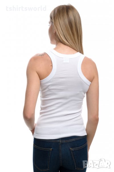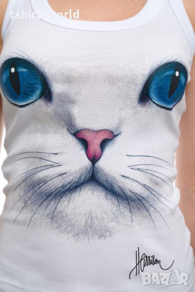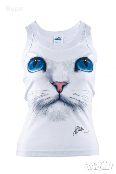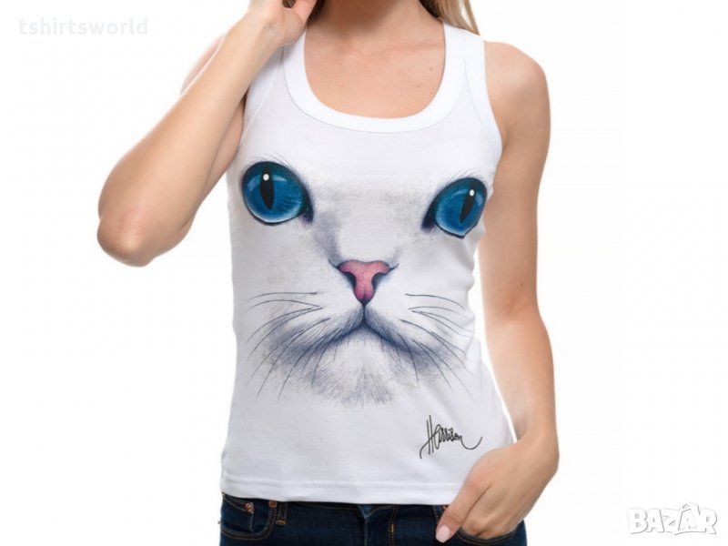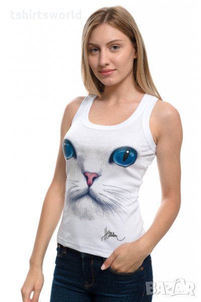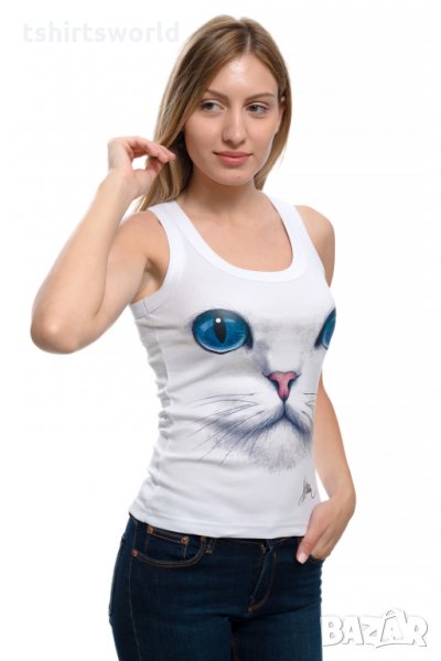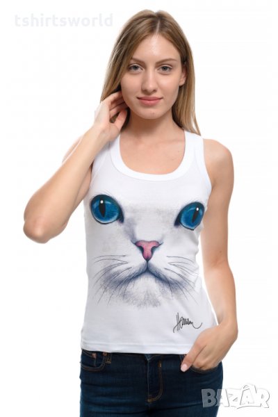 Нов дамски бял потник с 3D принт Котка със сини очи, Х-гръб, прав гръб