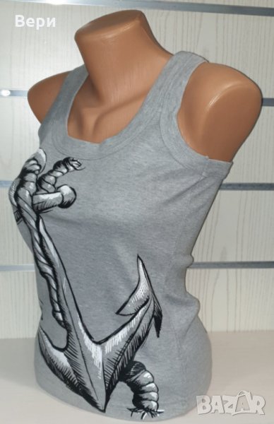 Страхотен нов сив дамски потник с трансферен печат Голяма котва, морски, U-образно деколте и Х-гръб. Произведен в България под марката PRINTEX от висококачествен 100% памук. Леката и удобна материя е гарант за прохлада и комфорт в горещите летни дни, а вталена му кройка го прави подходящ както за спорт, така и за ежедневно носене с дънкови панталони. Потникът е с професионално изработен висококачествен трансферен печат, устойчив на пране с години и може да се пере при температура до 40 градуса. Спокойно можем да гарантираме за качеството на изработката и ярките цветове на дизайна.
