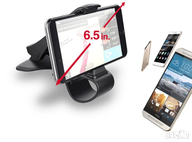 Универсална стойка за автомобил тип "щипка" Подходяща за телефон/ GPS навигации и други мобилни устройства с размери на устройството от 3 инча до 6.5 инча.