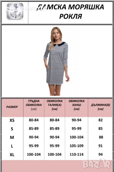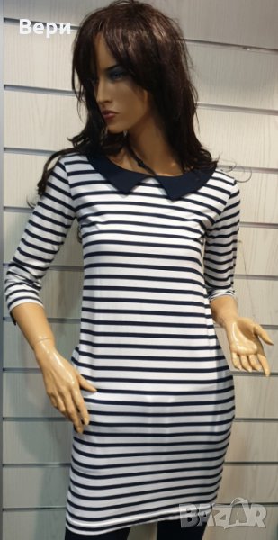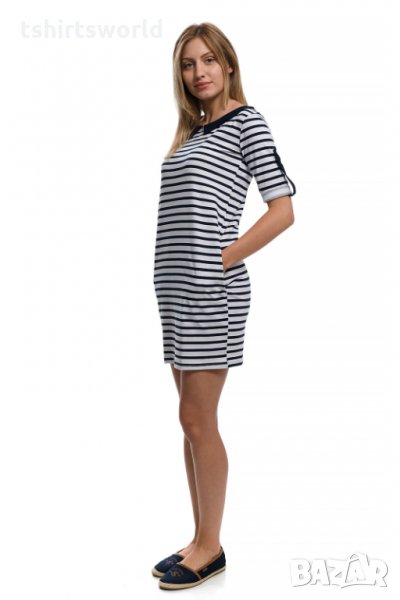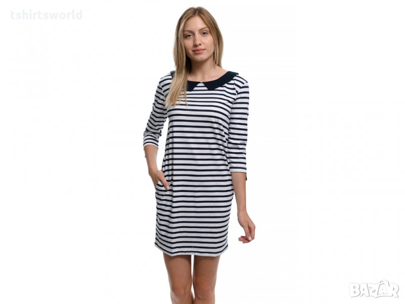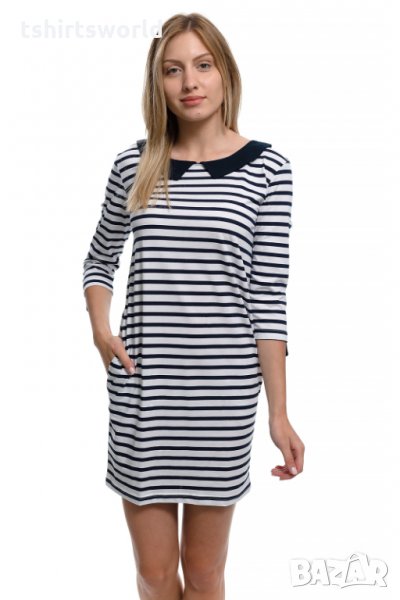 Страхотна нова дамска свободно падаща моряшка рокля на тъмносиньо и бяло райе, с якичка и 3/4 ръкави, произведена в България под марката PRINTEX. За изработката на този, прекрасен модел е използван 100% памук . Подходяща както за официални събития, така и за ежедневието, като допринася за Вашият комфорт, дори в най-горещите летни дни. Съчетанието между бяло-синьо райе и синьо трико придава спортно-елегантен стил на роклята. Високото качество на изработка не позволява разтегливост, завалване или губене на форма при пране.
