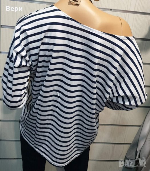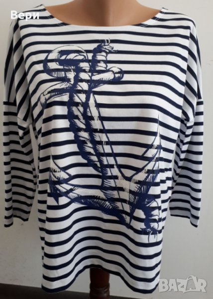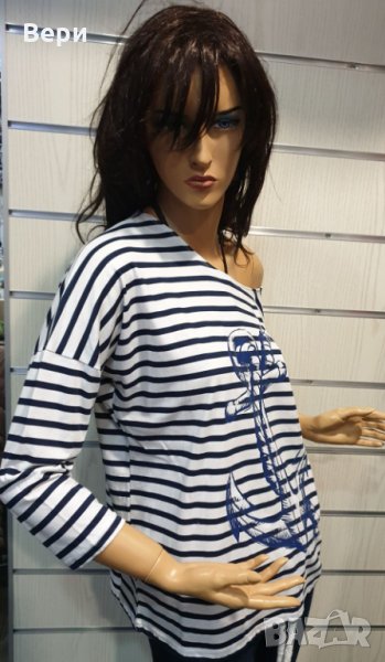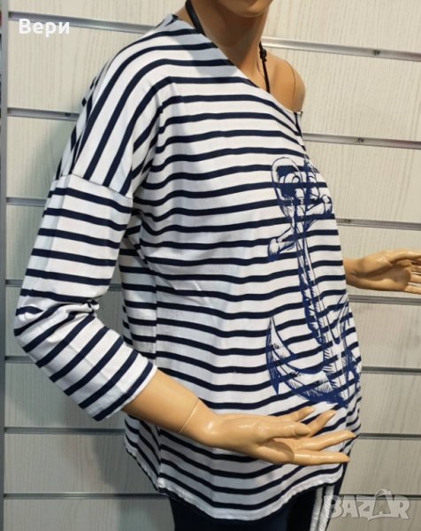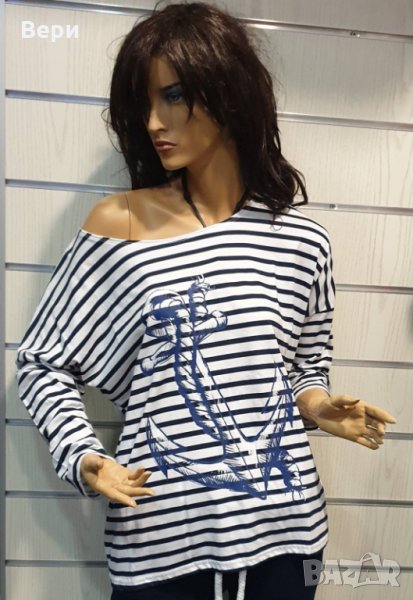 Страхотна нова дамска моряшка блуза с паднало рамо ( може да се носи и като стандартна блуза!!!) и трансферен печат Котва, на тъмносиньо и бяло райе, произведена в България под марката PRINTEX. За изработката на този, прекрасен модел е използван 100% висококачествен памук . Подходяща както за официални събития, така и за ежедневно носене, като допринася за Вашият комфорт, дори в най-горещите летни дни. Съчетанието между бяло-синьо райе и синьо трико придава спортно-елегантен стил. Високото качество на изработка не позволява разтегливост, завалване или губене на форма при пране.