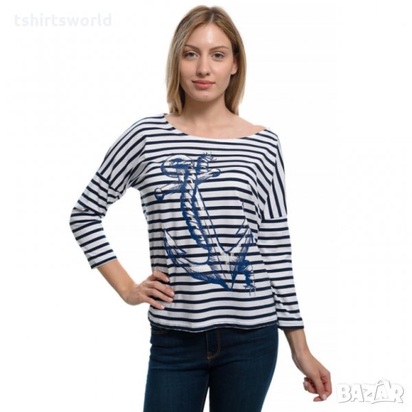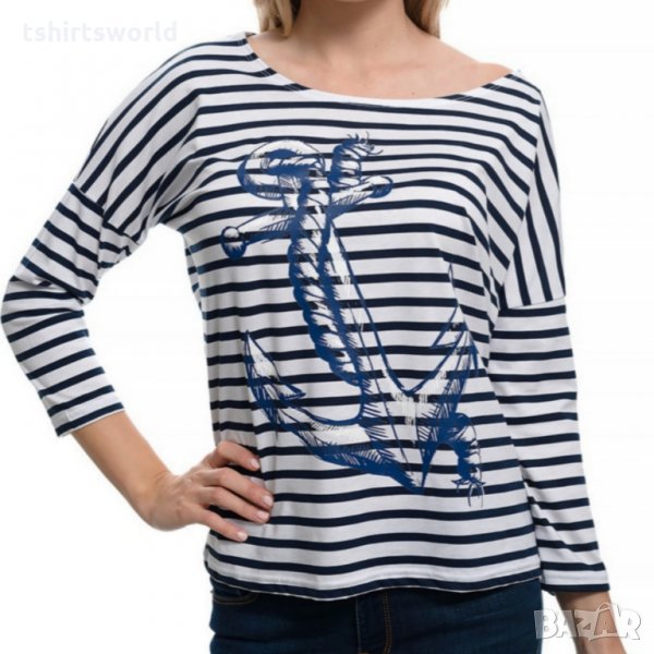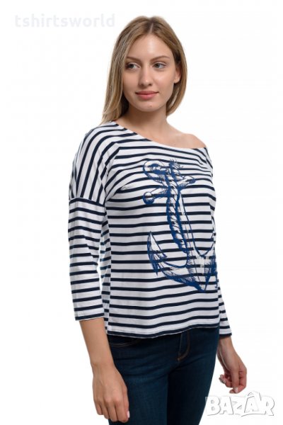 Нова дамска моряшка блуза с паднало рамо, трансферен печат Котва