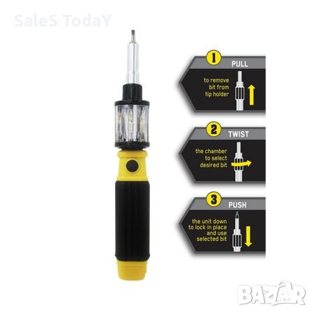 Уникално удобен инструмент за всеки майстор - отверка 6 в 1 с вграден пълнител за останалите инструменти. Изключително лесно превключване само с едно завъртане и избутване и вече имате желания накрайник, когато режите да смените изтеглете надолу, завъртете пълнителя до желания накрайник, избутайте и Вашата супер удобна отверка е готова със следващата приставка.
