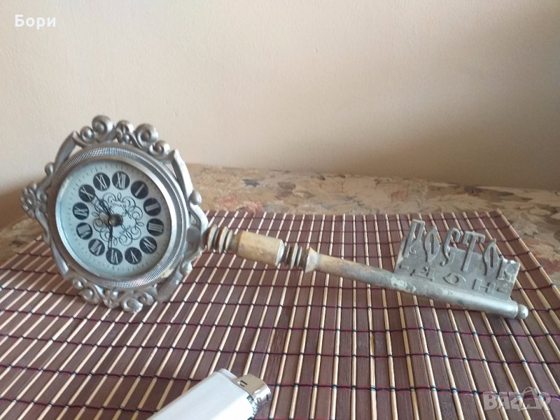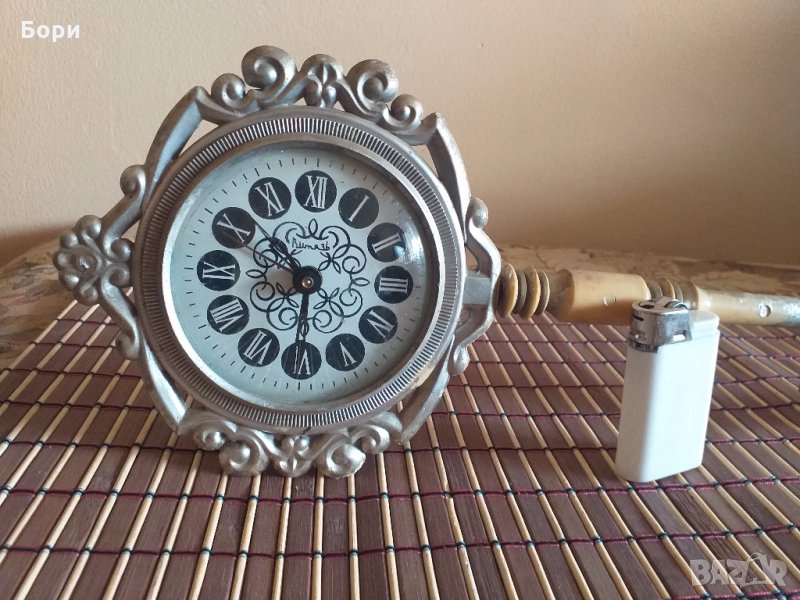 Механичен настолен часовник.Дължина 35см,външен вид видно от снимките,технически,тръгва ,спира нужна профилактика.