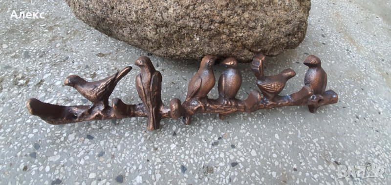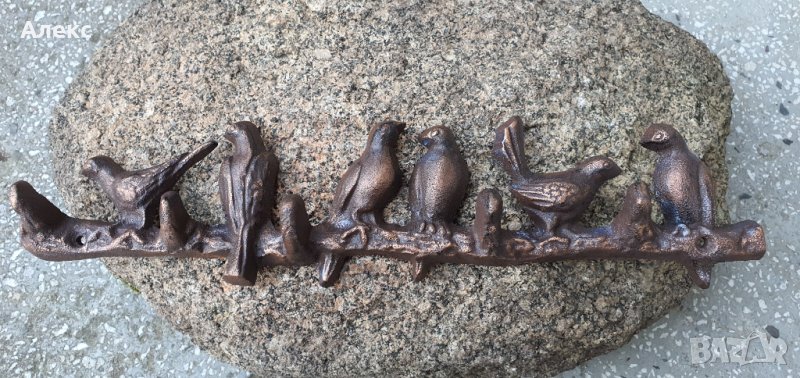 Нова чугунена закачалка, патинирана художествено в медно. 6 пиленца. 5 окачалки. Дължина: 43см Височина: 10см Ширина: 5см Тегло: 1.2 кг Материал: чугун