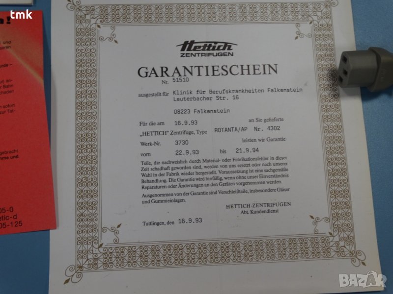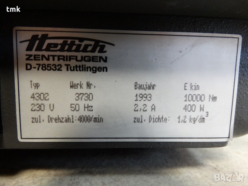 Фирма "Техно Маш Комплект" ЕООД предлага употребявана, но в отлично състояние и със запазени технически показатели лабораторна центрофуга Hettich Rotanta. Уредът е със следните параметри: