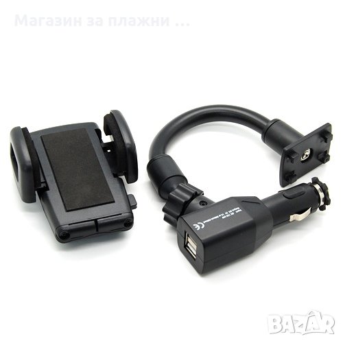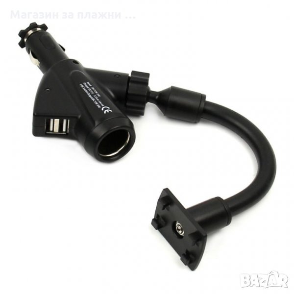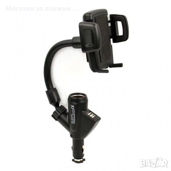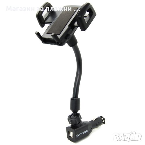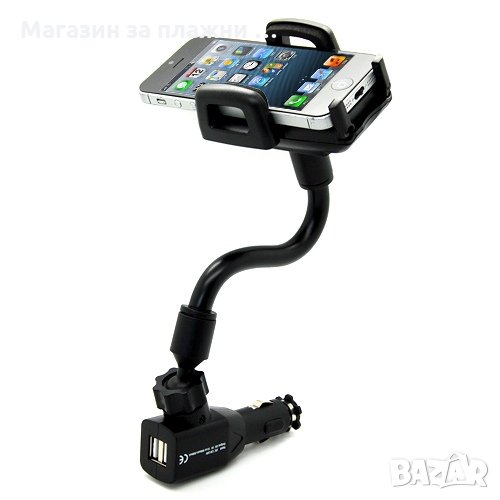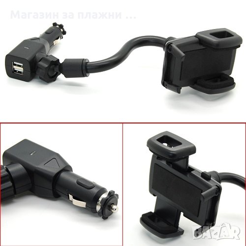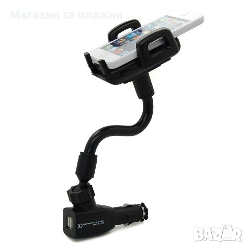 Регулираща се стойка за телефон за кола с 2 USB входа. Включете го в запалката на колата и телефонът ви ще се зарежда докато карате.