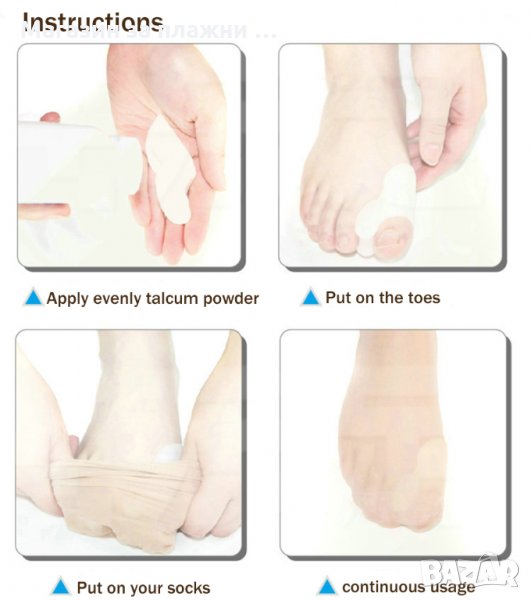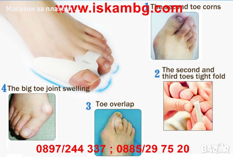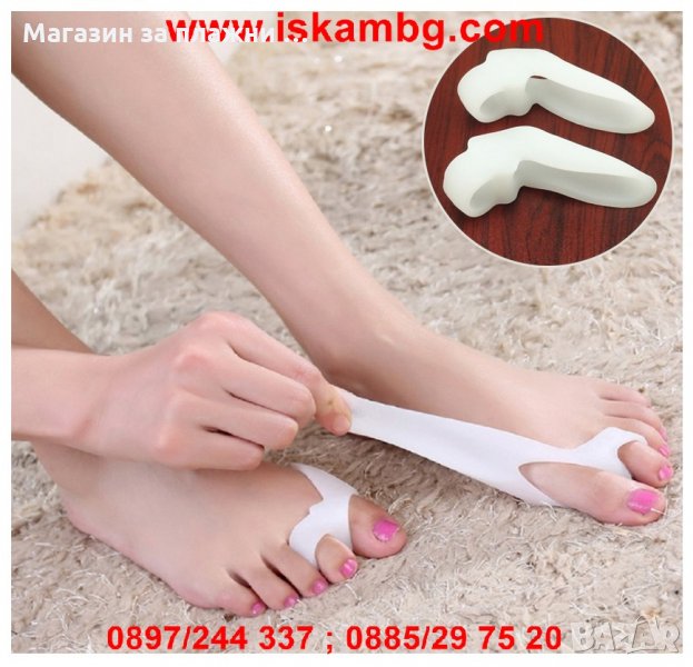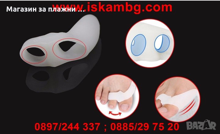Силиконовия разделител е произведен от мек, еластичен, нетоксичен, антибактериален и удебелен медицински силикон със специално изграден разделител между първи, втори и трери пръст на крака. Шината е съобразена с анатомията на долния крайник и поддържа правилната позиция на трите пръста при валгусни деформации и не позволява триенето и притискането им, като възстановява правилната им форма. Основната цел на протектора е да намали болките, предотврати ставни възпаления, мазоли, ранички в областта, кожни втвърдявания и деформации на палеца и показалеца, които се получават от носене на неудобни обувки, подагра, диабет, наследствен фактор, повечко килограми, пренатоварване и слаба костна система. Шините абсорбират налягането в областта на трите пръста, което създава тежестта на тялото и спомагат за намаляване на напрежението, като създават чувство за удобство, комфорт и удоволствие при носене. Силиконовите шини са издължени към задната си част, което предпазва страничната кост от търкане в обувката, а в предната си част освен, че разделя и същевременно спомага за изправяне на пръстите в нормално положение, като по този начин се премахва дискомфорта от изкривяването им и се облекчава болката. Сепаратора за пръсти не запарва крака, защото не повишава температура по – висока от телесната и не може да падне или изплъзне, защото се захваща здраво за първи, втори и трети пръст, което позволява да се носи с обувки, при спортуване, на работа, в домашни условия и т.н. Протектора е подходящ за многократна употреба, а почистването му може да се извърши с обикновенна вода или препарат по избор, което не нарушава цялостта и свойствата му.