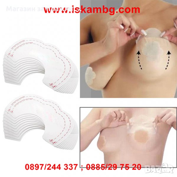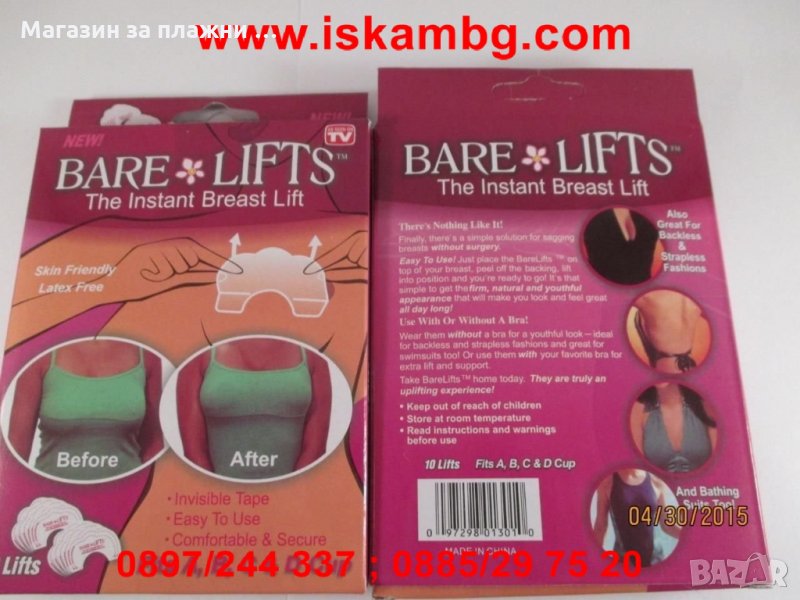 Дрехите, които носим през лятото са с голи гърбове или рамене, а всички знаем колко е досадно да се вижда сутиенът ни през тях... Тук на помощ идват невероятните незабележими лепенки, които надеждно повдигат бюста за стегнат и оформен вид! Лепенките BareLifts са страхотен продукт, проектиран да повдигне и поддържа гърдите Ви, за да изглеждат по-красиви и естествени във всяка дреха - без надничащи презрамки и закопчалки. Невидимите помощници BareLifts се поставят и се отстраняват изключително лесно с помощта на специалното безвредно лепило, което не причинява болка при отлепяне. За секунди се сдобивате с гърдите, за които мечтаете! Универсален размер с пунктир ако желаете да изрежете за по малки чашки. Преди употреба: - Уверете се, че кожата ви е чиста и суха. - Изрежете BareLifts по пунктираната линия в зависимост от размера на вашия бюст. (Ако използвате чашка D или по-голяма, не е необходимо изрязване). - Повдигащите лепенки могат да се използват без сутиен от дамите с чашка A, B, C и D. - На дамите с чашка, по-голяма от D, препоръчваме да използват лепенките BareLifts едновременно със сутиен, с цел допълнителна сигурност и спокойствие. Важно: BareLifts не се поставя в долната, а в горната част на гърдата! Употреба на BareLifts: - Обърнете лепенката BareLifts и отстранете предпазното фолио в долната ѝ половина. - Залепете долната част на BareLifts върху горната част на гърдата. С леки притискания изпънете лепенката добре по кожата, за да не се набира и набръчква. - Обърнете (завийте) надолу горната половина на BareLifts и отстранете предпазното фолио от нея. - Повдигнете гърдата и залепете горната част на BareLifts до желаната от вас позиция. - С леки притискания залепете горната част на лепенката BareLifts докато плътно прилепне към кожата. - Повторете същото и с другата гърда. Внимание: За всяка гърда трябва да се използва САМО по една лепенка. BareLifts е напълно безвреден за кожата, не съдържа латекс и е водонепропусклив. При производството на BareLifts са използвани медицински лепила, напълно безвредни за кожата. Препоръчваме ежедневно да подменяте лепенките. В случай, че се появи леко зачервяване, изчакайте един или два дни, преди отново да използвате лепенките. В редките случаи на по-сериозни зачервявания или кожни раздразнения се препоръчва употребата на лепенките да бъде преустановена. Кожа със слънчев тен или такава със слънчеви изгаряния може да бъде по-чувствителна, заради което препоръчваме да изчакате известно време, преди да използвате лепенките. Съхранение: - Съхранявайте на недостъпно за деца място. - Съхранявайте на стайна температура. - Да се съхранява далеч от слънчева светлина или източници на топлина. 10 броя в комплект!