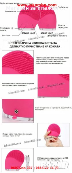 Уредът е специално проектиран и произведен за дълбоко почистване на кожата на лицето. Той излъчва вибрации, чрез които силиконовата му повърхност почиства порите и премахва замърсяванията. Също така отстранява мастния секрет и следите от грим. Елегантно и в същото време лесно за употреба, устройството ще възстанови сиянието на кожата ви след всяка процедура. 3 почистващи повърхности: за чувствителна, нормална и мазна кожа, както и за деликатните зони на лицето. То е идеално допълнение към всяка баня.