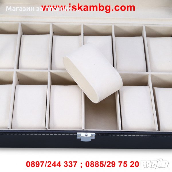 Подходяща за часовници,както и за други аксесоари.Кутията разполага с 12 отделения за часовници с възглавнички за тях.