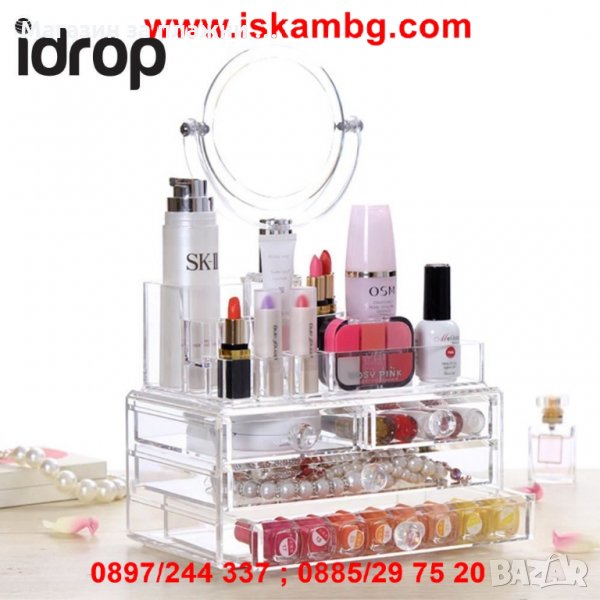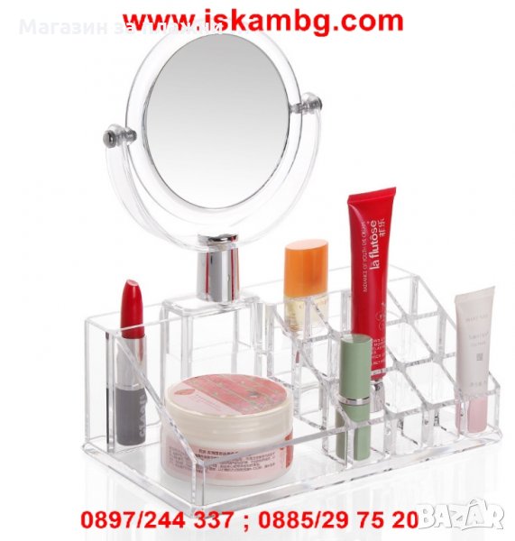 Идеален за подреждане на червила, лакове, козметични аксесоари, грим и др. С негова помощ ще въведете ред на тоалетната си масичка и всичките ви гримове и козметика ще са на видно място, лесни за намиране. Органайзерът има прикрепено козметично огледало, което го прави удобен и за гримиране и ежедневни козметични процедури!