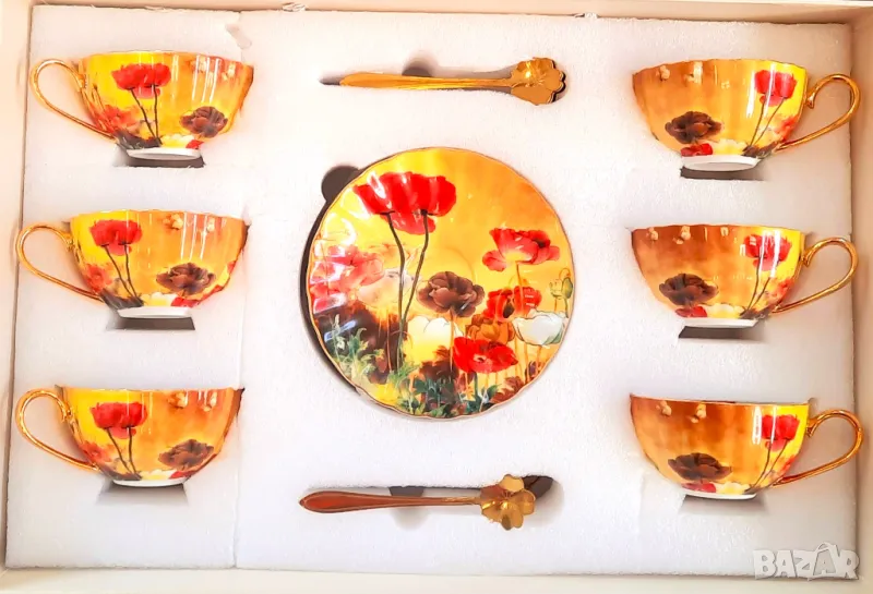 Красив комплект "Разцъфнал мак" чаша и чинийка костен порцелан .