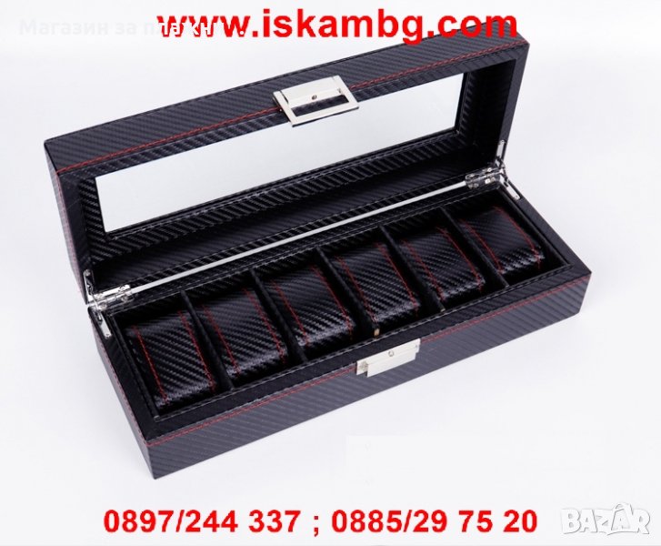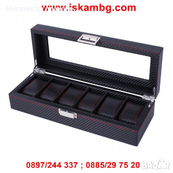 Кутия за съхранение на часовници е специално предложение за всеки любител на аксесоарите. Подходящ избор за мъже и жени, а капацитетът е 6 часовника. Разполага с мека вътрешност, която предпазва часовниците от нараняване. Капакът е прозрачен за лесен визуален достъп до съдържанието. Облицовката е от красива синтетична кожа и изглежда луксозно. Кутията е подходяща за часовници, гривни и други подобни бижута.