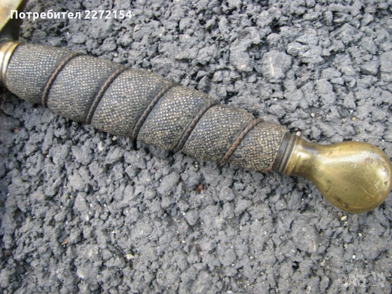 От края на 19 век,в отлично състояние.Кожена кания,без забележки с 2 бронзови накрайника,острието не е точено,гравирано е с различни сребърни насечки рисунки от двете му страни.С бронзов гард,като кръст.Дръжката е с кожа от риба скат,с оригиналните си оплетки,всичко автентично и без луфт.