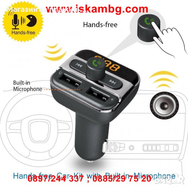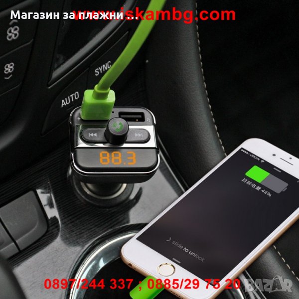 Трансмитер работещ с USB флашка, SD карта и Bluetooth. Включвате Bluetooth на телефона си, сдвоявате го с трансмитера и слушате музика в колата си напълно безжично без каквито и да е кабели.