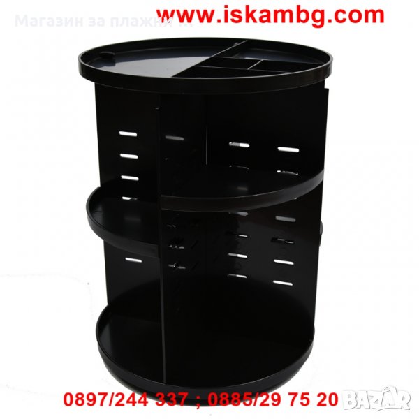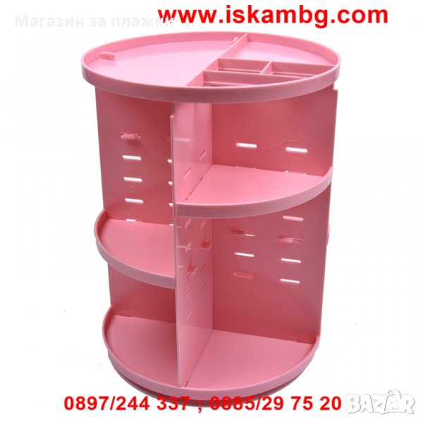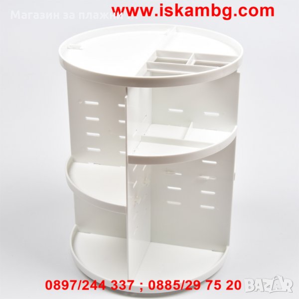Много удобно решение за всяка дама - спретнат въртящ се органайзер за съхранение и сортиране на гримове, продукти за красота и много други аксесоари! С този стелаж ще организирате моментално цялата си козметика и с едно завъртане лесно ще откриете точно това, което търсите. Бързо, лесно и много практично. Красива организация за всички четчици, стикове, гримове, бижута, балсами за устни, червила, сенки, кремове, по-подредени от всякога! Спестете време като се организирате и се съсредоточете върху стайлинга си само с един поглед.