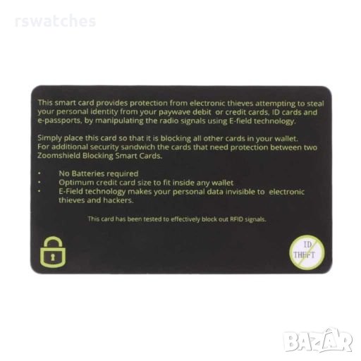 Защитен протектор изработен от защитно фолио, който предпазва вашата безконтактна дебитна и кредитна карта от източване. На много места вече може да се сканира вашата карта от разстояние, като по този начин източват сметката ви. Благодарение на този протектор това вече е невъзможно. Радиочестотната идентификация (RFID) е технология, която използва комуникация чрез електромагнитни вълни за обмен на данни между терминал и електронен етикет, прикрепен към обект с цел идентифициране и проследяване. RFID протекторите предотвратяват електронното събиране на данни.