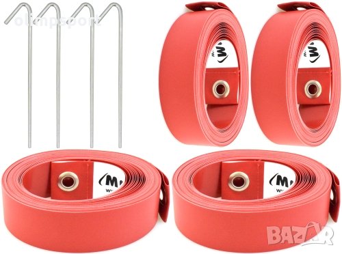 Комплектът включва 2 ленти по 16 м и 2 ленти по 8 м /закачени една за друга/, метални обтегачи и метални колчета за фиксиране към терена. Лентите са широки 5 см и са направени от здрав текстил, устойчив на атмосферни влияния и абразиви.