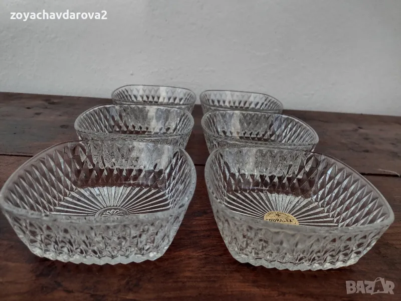 ПРОИЗВОДИТЕЛ: DURALEX FRANCE. ЗАКУПЕНИ ПРЕДИ ГОДИНИ ОТ ЧУЖБИНА, ЧИСТО НОВИ. ПОДХОДЯЩИ СА ЗА ЯДКИ, СОСОВЕ, ХАЙВЕР И ДР. МАТЕРИАЛ - ЗАКАЛЕНО СТЪКЛО С ГЕОМЕТРИЧНИ МОТИВИ И ГРАВИРАНА ОСНОВА. ИЗДРЪЖЛИВИ НА УДАРИ И ГОРЕЩИ ТЕЧНОСТИ. МОЖЕ ДА СЕ ИЗПОЛЗВАТ В МИКРОВЪЛНОВА (НЕ И В ОБИКНОВЕНА ПЕЧКА) КАКТО И В СЪДОМИЯЛНА МАШИНА. РАЗМЕРИ: ШИРОКИ 11 СМ., ВИСОКИ 4 СМ., ОБЕМ - 0,250 МЛ. ОБЯВЕНАТА ЦЕНА Е ЗА ШЕСТТЕ БРОЯ КУПИЧКИ.