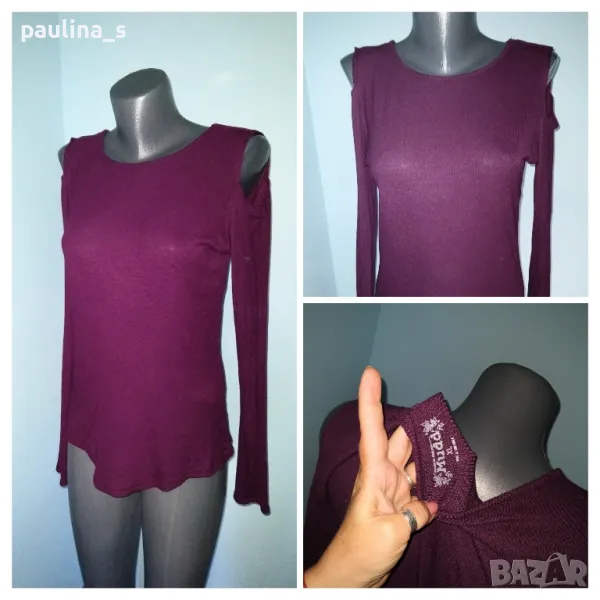2. Колаж / L / 3XL / "Mudd" органичен памук. Цената е крайна 14,99лв. Лилава Еластична брандова блуза с дълъг ръкав и открити рамене. Долната част пада заоблено като туника. Материята е памук и ликра и покрива няколко размера. Без дефекти и етикет, нова.