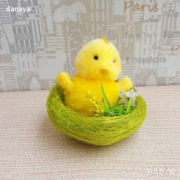 Великденска украса пиле в гнездо. Подходящо за украса и декорация към великденските яйца и великденската трапеза. Пиленцето е изработено от плюш, а гнеждото от естествени материали.