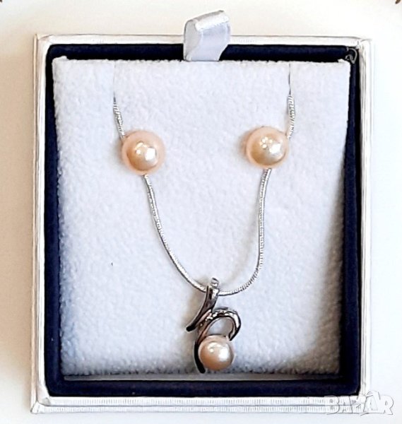 - Комплект колие сребърен синджир с бледо розова висулка перла и същият цвят перла обици със сребърен цифт и винт.