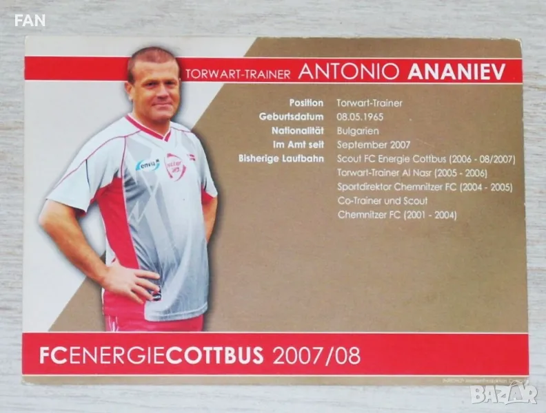 Предлагам оригинална картичка с АВТЕНТИЧЕН саморъчно написан автограф с маркер на Антонио Ананиев като треньор на вратарите в германския тим Енерги Котбус от сезон 2007/08.