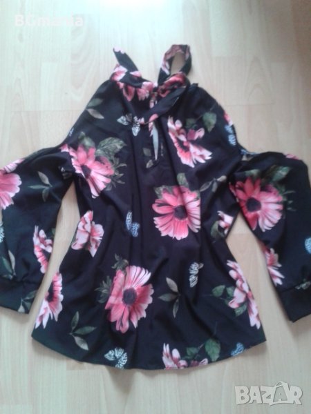 Блуза в черно с цветя и цепки на рамената размер М-Л → Обява 28425443