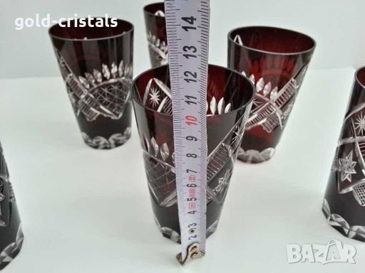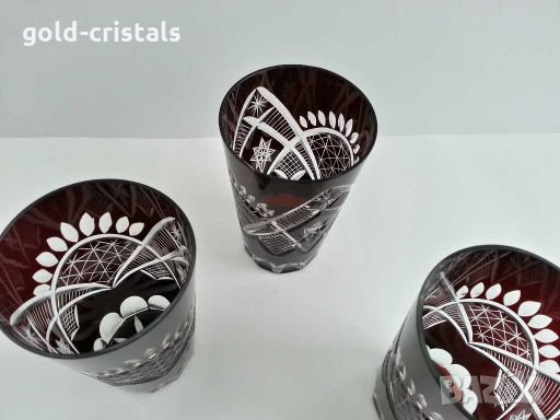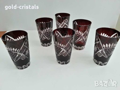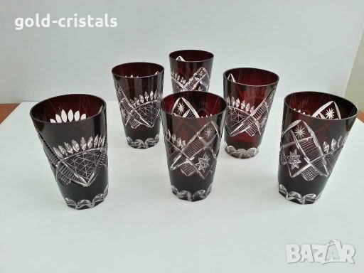 Сервиз кристални чаши 6 бр -590лв гарафа 145лв цветен червен кристал ръчно гравирани кристално стъкло комплект сет лот ретро арт декор винтидж колекция старинни антикварни предмети обзавеждане за дома и семейството подходящи за подарък за ценители и колекционери втори сервиз 4бр чаши и гарафа и една чаша подарък 260лв