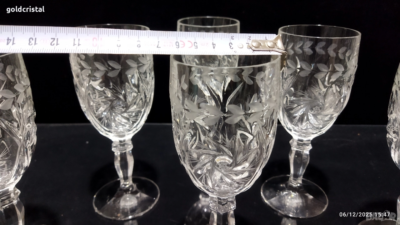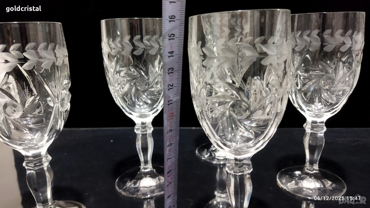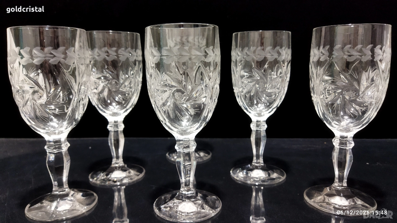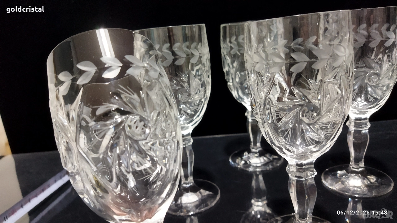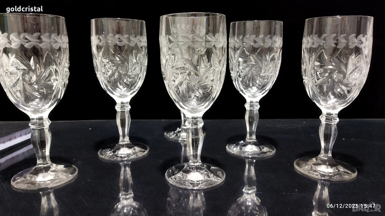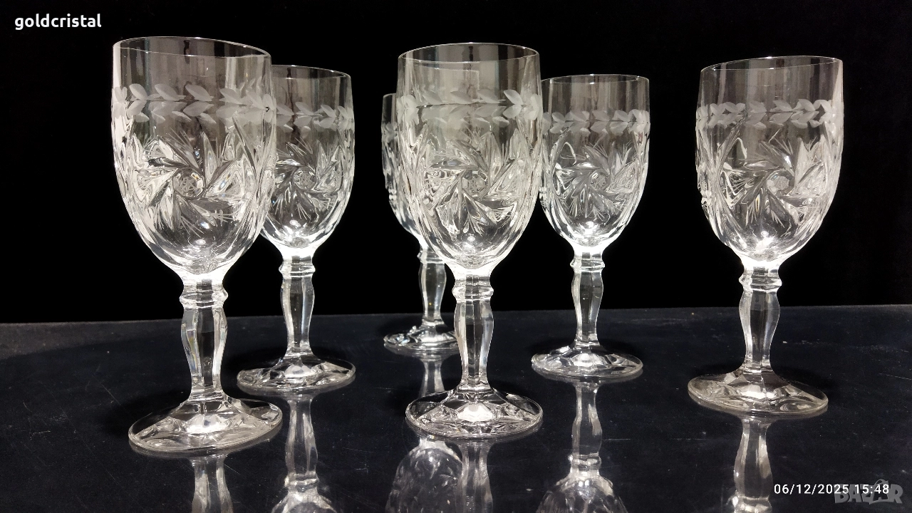 кристални чаши за вино на столче гравирани 6бр неизползвани сервиз комплект сет лот ретро арт декор винтидж колекция стари антикварни предмети обзавеждане за дома и семейството подходящи за подарък за ценители и колекционери чаши за вино кристално стъкло чаши чашки стъклени кристален вино ракия бира уиски аперитив ликьор безалкохолно сок десерти Крем сладолед мелби кремове ядки купички купи стъкло кристал стъклени кристални чинии порцелан прибори за хранене вилици лъжици лъжички вилички ножове салфетки посуда кухня хранене маса празници гости трапезария