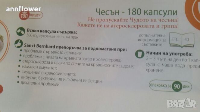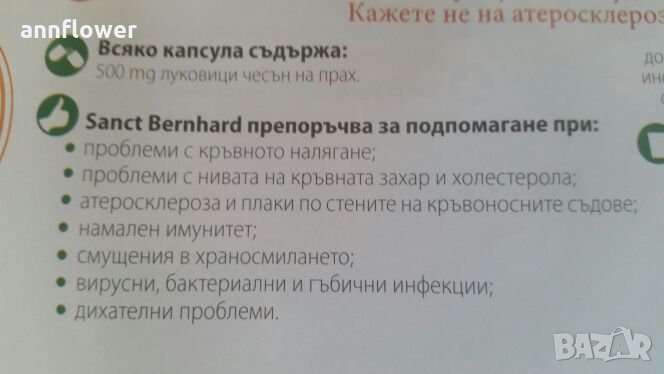 Качествата на чесъна са били известни още преди хилядолетия. Една от най-ценните съставки на чесъна е етеричното масло, наречено алицин. То е в състояние да предотврати развитието на над 20 вида бактерии. При термична обработка чесънът губи свойствата си, затова чесновите капсули на Sanct Bernhard са приготвени чрез щадящ метод на изсушаване. Така се гарантира, че в използвания прах от луковици, здравословните съставки на чесъна се запазват по сигурен начин.