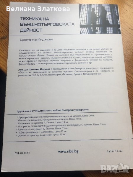 Техника на външнотърговската дейнаст-пето допълнено издание-Икономика- доц.д-р Цветанка Инджова.Издателство “Нов български Университет”, 187с.