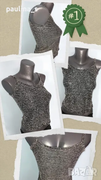 2. Колаж / S / L - Еластичен брандов потник с със сребърен акцент / малък размер. Цената е крайна 9,99лв. Еластичен потник със сребърен акцент. Моделът е стандартен, материята е ликра - доста еластична и покрива няколко размера. Нов е, без дефекти и етикет, една бройка.